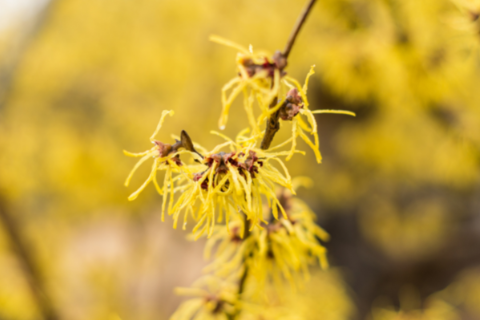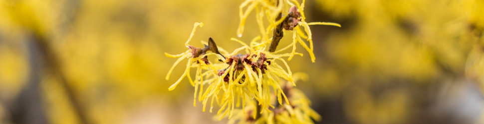 L'hamamélis fait partie de la famille des hamamelidaceae. C'est un arbrisseau aux feuilles vert mat. L'hamamélis de Virginie également appelé "noisetier des sorcières" est reconnaissable par ses rameaux rappelant le noisetier et ses fleurs qui éclosent en automne sont d'un jaune d'or et poussent sur des sols très irrigués et riches en humus et acides.